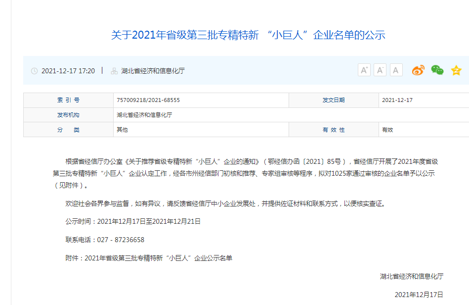 2021年12月17日,湖北省经济和信息化厅正式发布《关于2021年省级第三批专精特新“小巨人”企业名单的公示》,我司入选湖北省专精特新“小巨人”企业名单。
