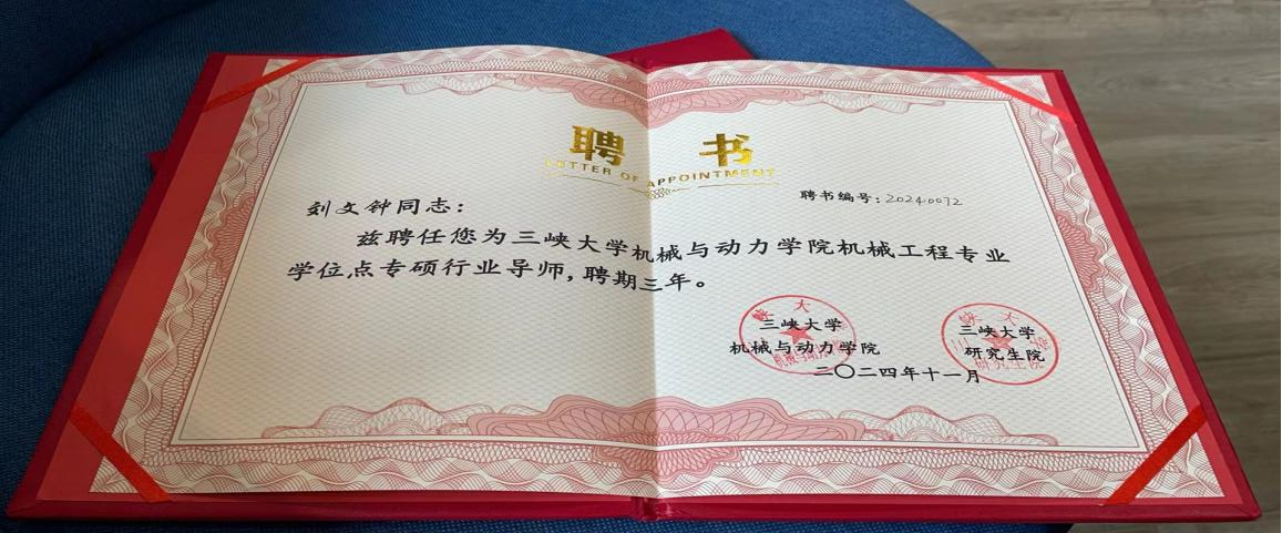 日前,中威集团董事长刘文钟分别被三峡大学聘为机械与动力学院机械工程专业硕士研究生指导教师。